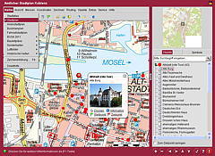 ... is an interactive and multi-lingual GIS viewer for maps and site-related data of all kinds. This product was launched in spring 1999 as the official city map of the city of Koblenz on the Internet. After this, it has been used by many authorities, communities, cities, companies and institutions. Due to the offline capability of the system, numerous special CD and DVD editions have been produced and published in the trade.